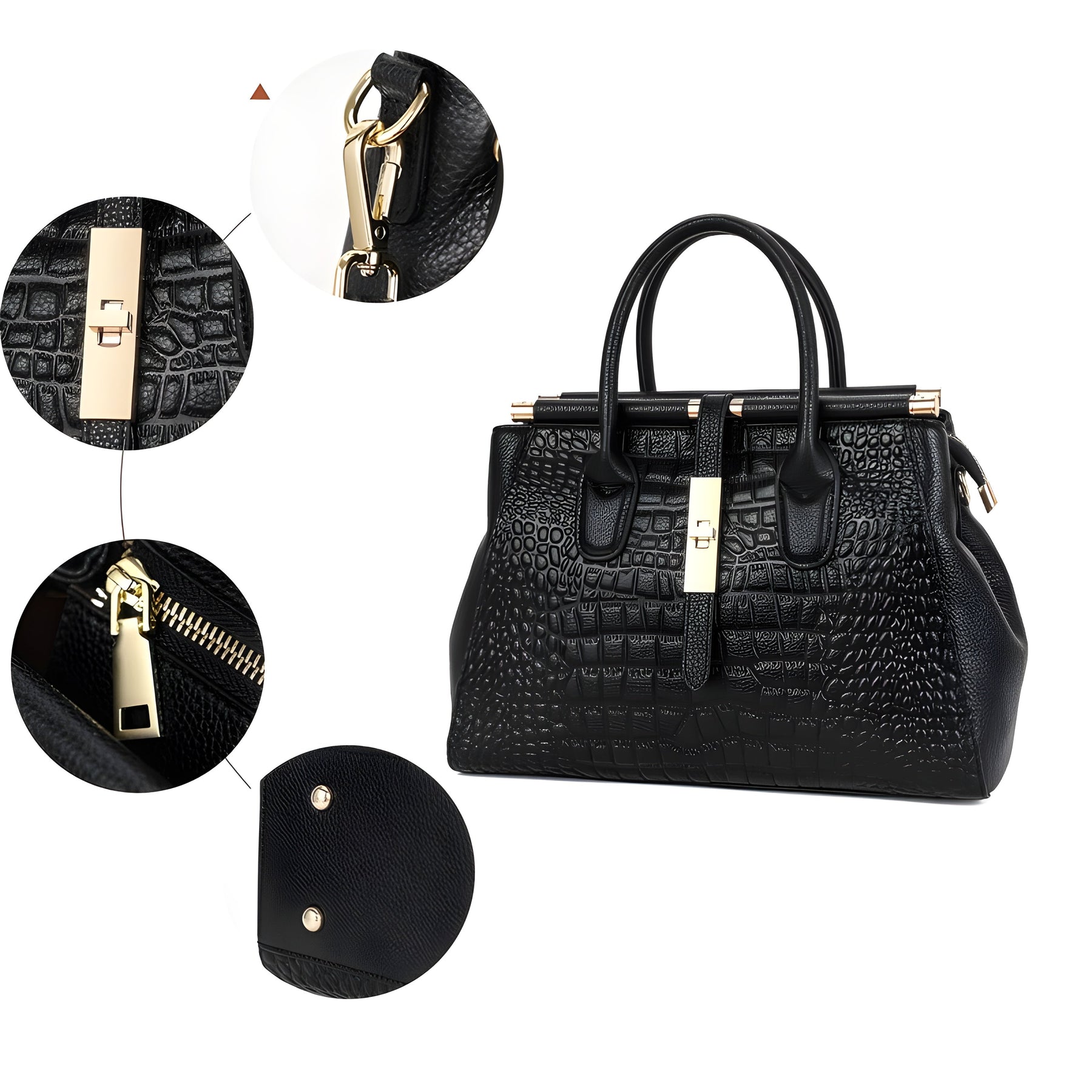 Elegancja spotyka się z wyrafinowaniem w tej mistrzowsko wykonanej torebce, która charakteryzuje się luksusowym, wytłaczanym wzorem aligatora na skórze najwyższej jakości. Strukturalny design jest zarówno nowoczesny, jak i ponadczasowy, a złote magnetyczne zapięcie dodaje odważny kontrast do gładkiego czarnego wykończenia, podkreślając jej elegancki urok.