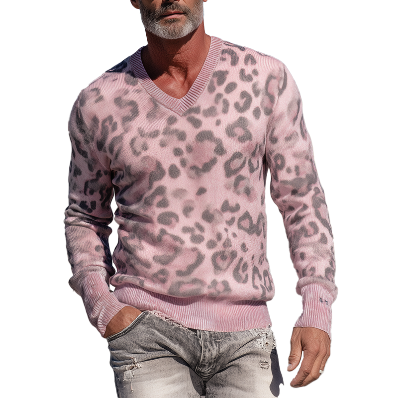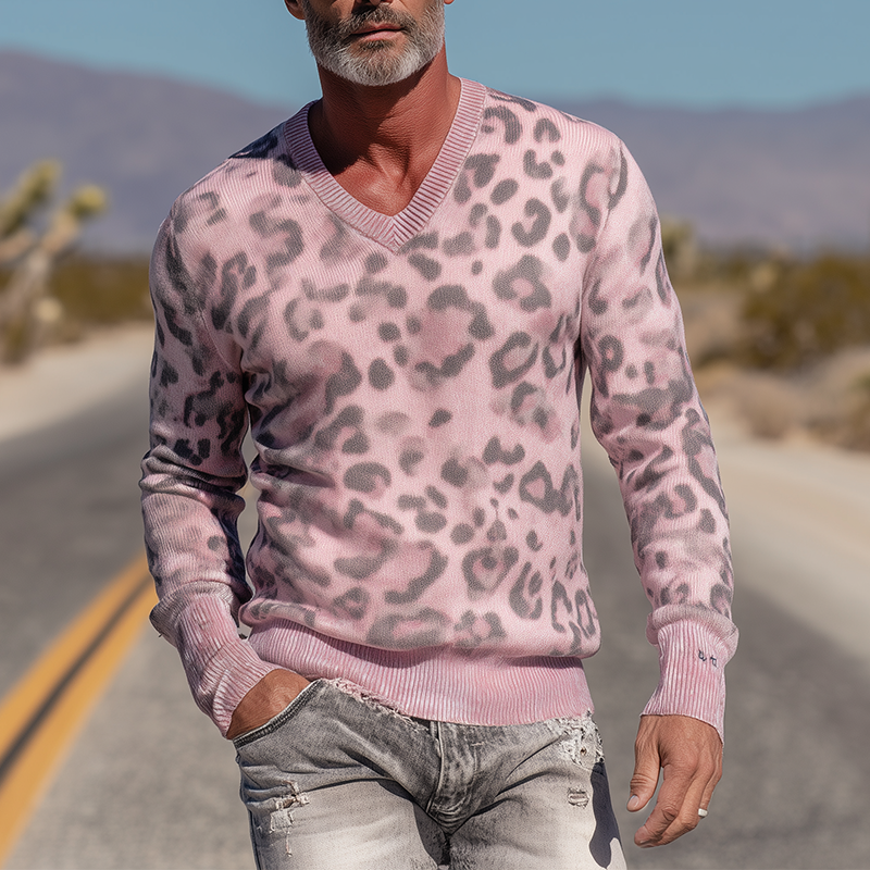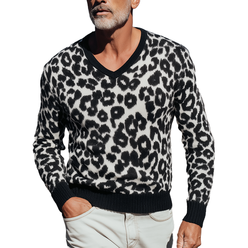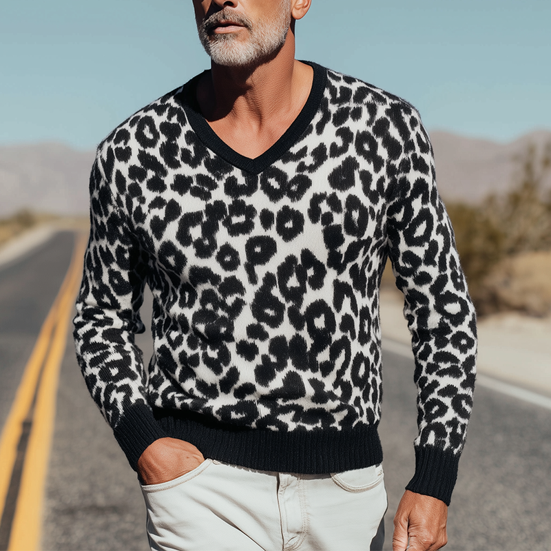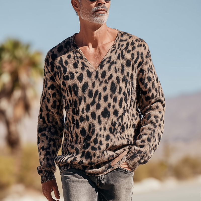 Męski Vintage Sweter Pleciony z Wzorem Lamparta i Dekoltem w Szpic MTA1437H0P