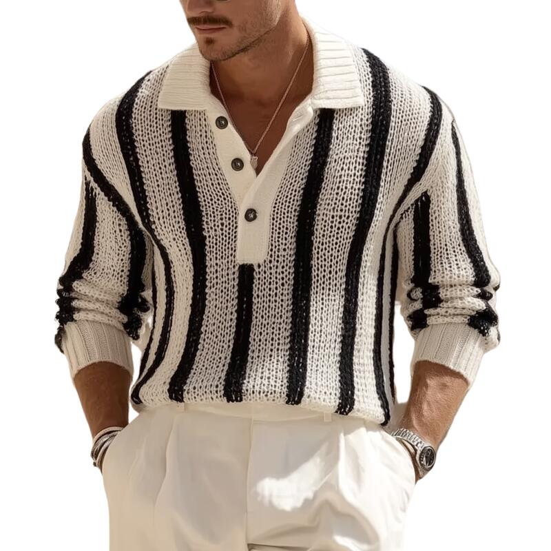 Męski vintage sweter z kontrastowymi paskami, oddychający, z kołnierzykiem polo, luźny, MTA2831H1M