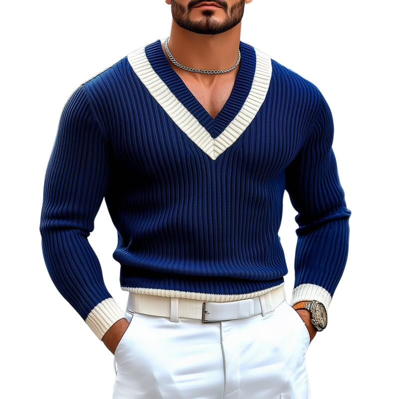 Męski Vintage Kontrastowy Sweter z V-dekoltem, Slim Fit, Długi Rękaw MTA2709H9M